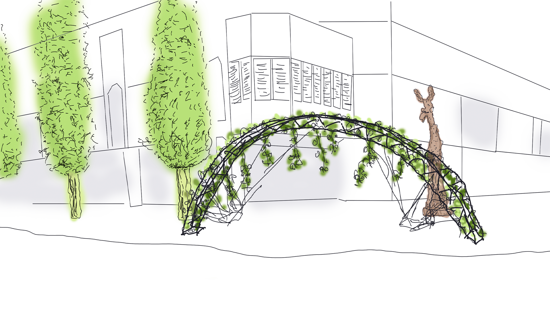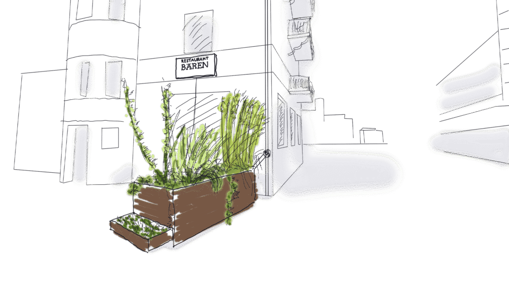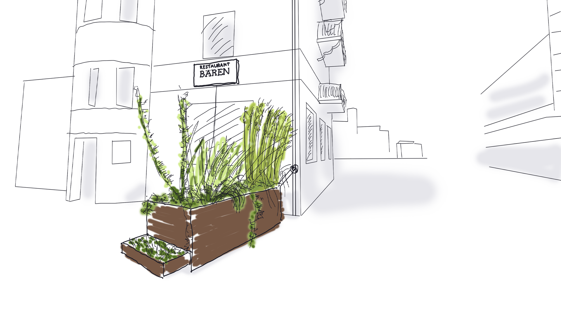 Der öffentliche Vorplatz in der Löwenstrasse bietet die ideale Voraussetzung zur Umsetzung einer Installation für Vertikalbegrünung: Die Pflanztröge haben ein beachtliches Volumen um berankte Elemente zu realisieren. Diese dienen zudem die auch als Schattenspender.